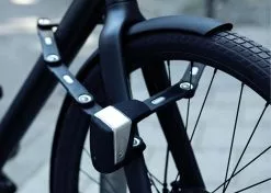 SH – support d’antivol pour un transport facile sur le vélo, qui peut être monté sans outils grâce à des sangles de serrage pratiques. L’antivol est retiré frontalement du support.