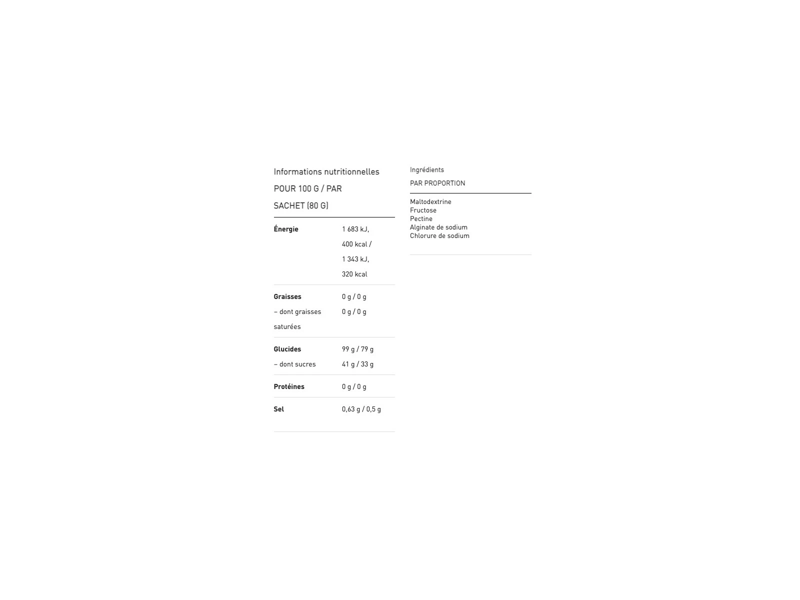 La boisson pour sportifs la plus riche en glucides au monde. Utilisée par les meilleur(e)s coureurs et coureuses au monde. Un sachet (500 ml) contient 80 grammes de glucides.