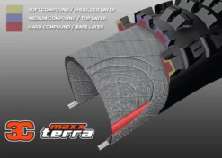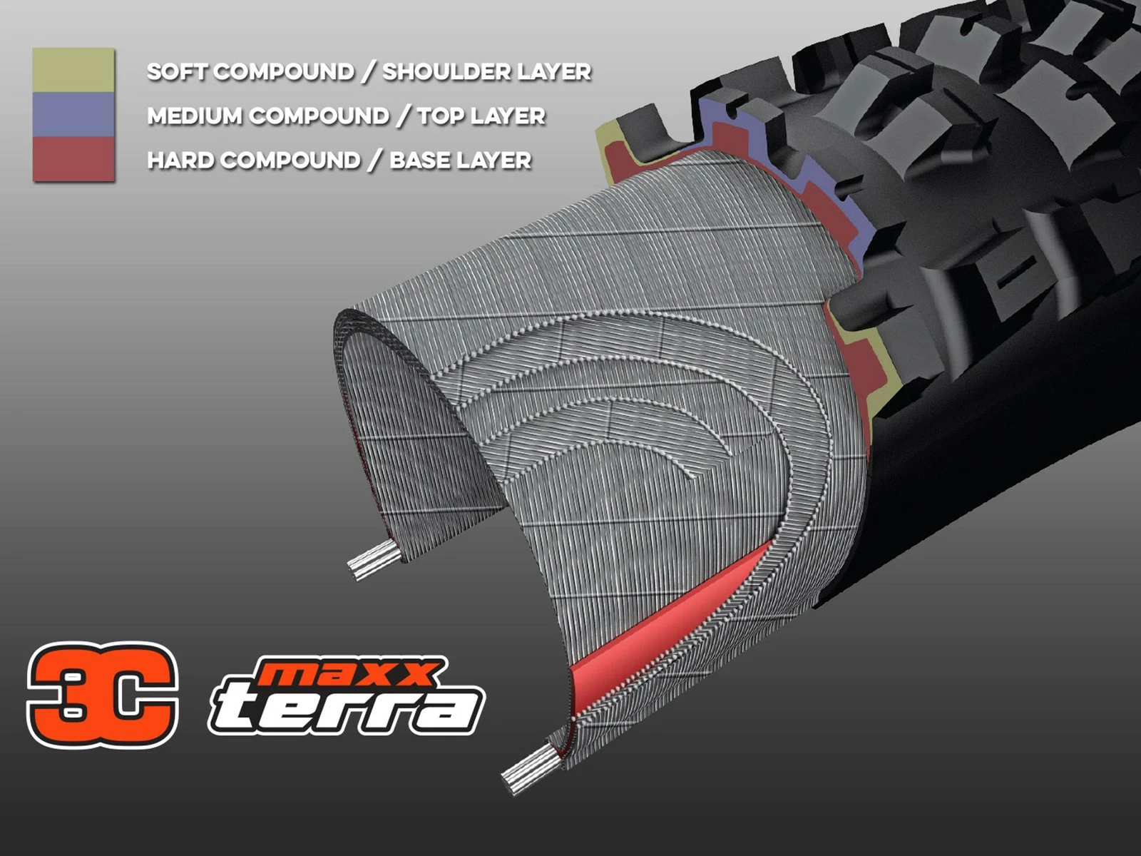 La surface de roulement 3C de Maxxis est formée d’une seule pièce constituée de 3 composés de caoutchouc différents, et non pas de deux bandes assemblées ultérieurement. Les surfaces de roulement peuvent ainsi être formées exactement suivant les exigences de chaque modèle de pneu, permettant d’optimiser les caractéristiques de conduite.