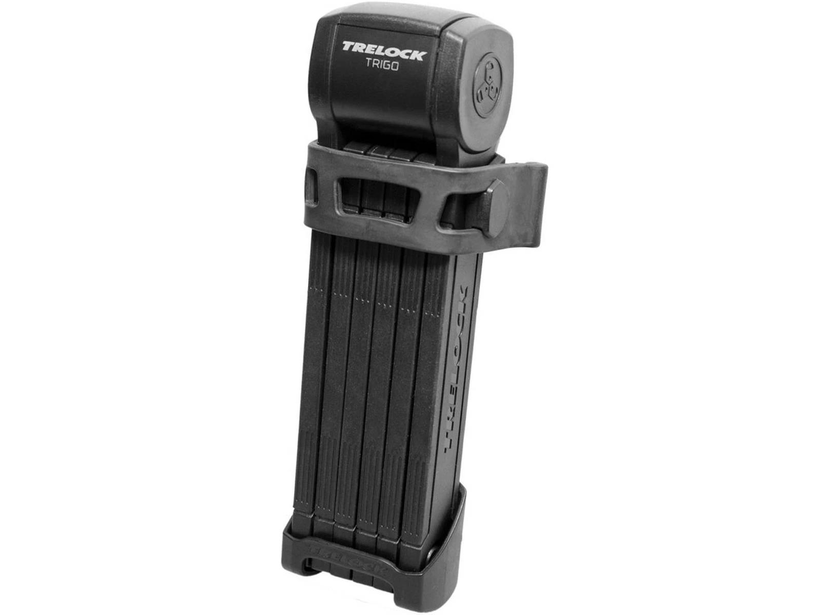 Grâce au cylindre de fermeture IN-X® du nouvel antivol FS 380 TRIGO®, la clé peut être insérée des deux côtés. Le capuchon de protection du cylindre redessiné protège non seulement le cylindre de verrouillage, mais rend également le verrouillage et le déverrouillage plus pratiques. Le FS 380 TRIGO® est basé sur la nouvelle conception simplifiée de Trelock. Tout en noir, la ceinture pliable est encore plus élégante qu’avant. Les maillons caoutchoutés en acier trempé protègent le vélo non seulement contre le vol, mais aussi contre les rayures.